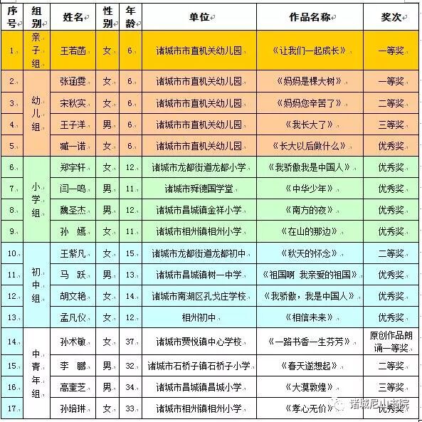 随后,我市选拔出的5个组别17名优秀选手参加了4月12至15日在潍坊市图书馆举办的潍坊地区选拔大赛,取得了优异的成绩。获奖情况如下:亲子组一等奖1组;幼儿组一等奖1名,二等奖1名,三等奖1名,优秀奖1名;小学组优秀奖4名;初中组二等奖1名,优秀奖3名;中青年组一等奖1名,二等奖1名,三等奖1名,优秀奖1名;诸城市图书馆荣获优秀组织奖。下表为我市参加潍坊市选拔赛获奖情况明细表。