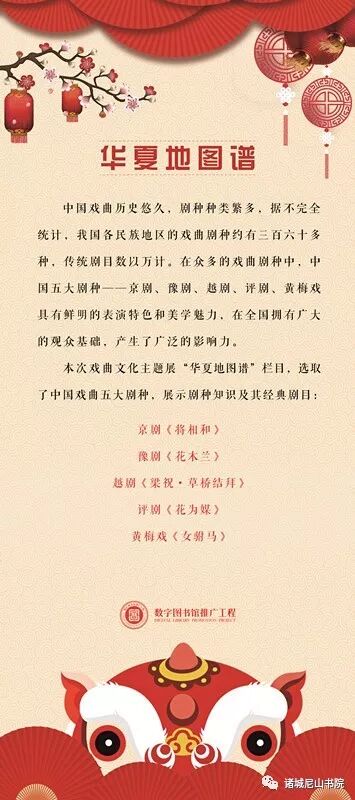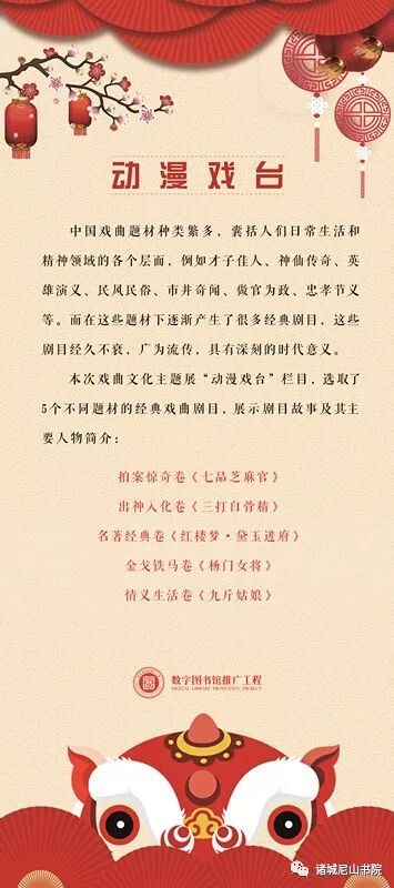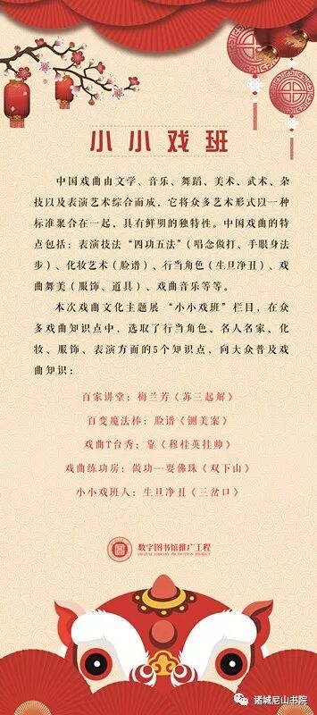 即日起将在诸城市图书馆一楼大厅举办“梨园贺岁·百戏昇平”戏曲文化主题展。本次展览是由国家图书馆数字图书馆推广工程办公室主办,诸城市图书馆承办,是以“网络书香过大年”为主题的线下活动;线上活动:“九州圆梦·美好生活”在线摄影征集、“书香博闻·畅享阅读”在线闯关答题、“经典传情·书福迎春”电子有声贺卡三个活动在“诸城尼山书院”公众号中也已开展。