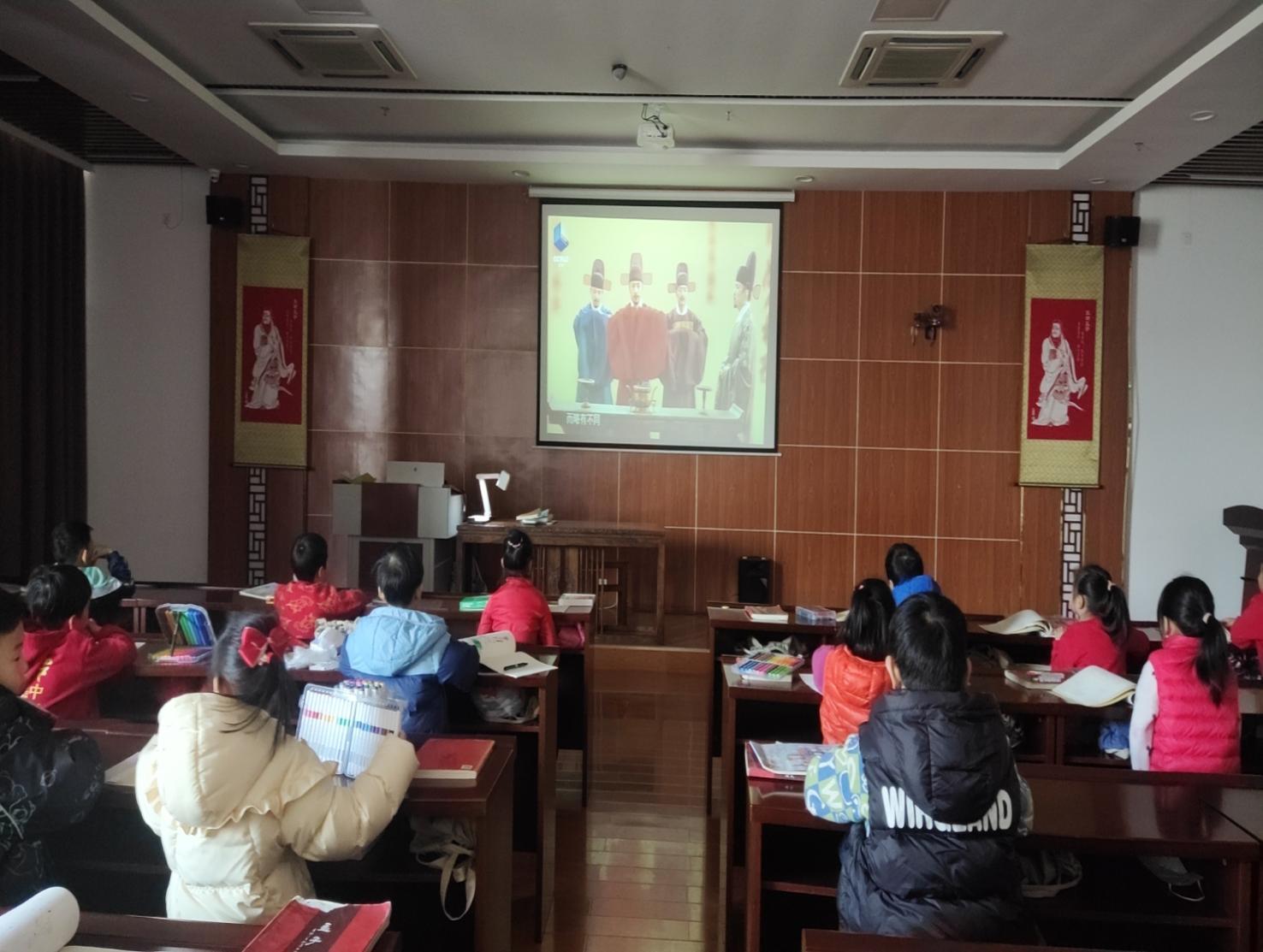 首先,同学们在家长的带领下来到二楼国学堂,早到的同学集体跟读《孟子·公孙丑章句》做课前收心。