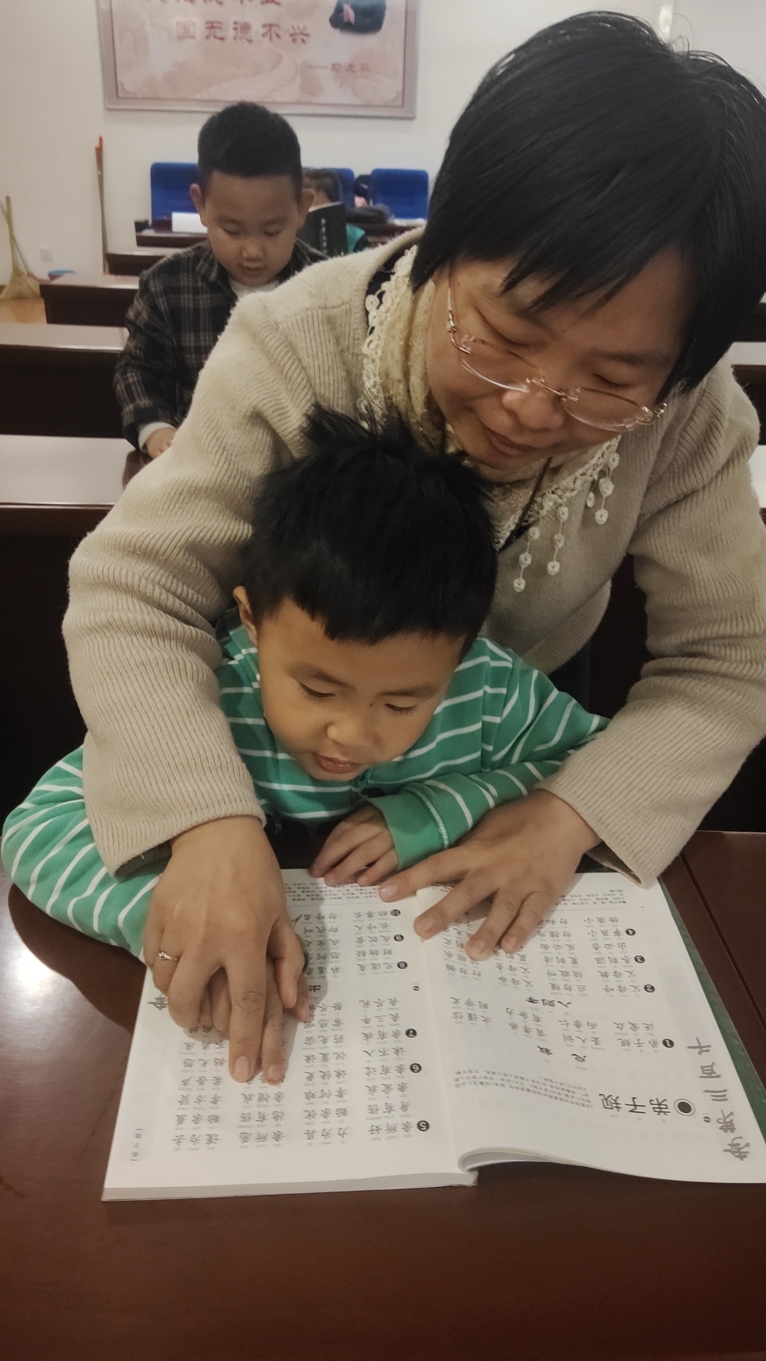上午8点10分签到,同学们在家长的带领下来到二楼国学堂,早到的同学接龙领读《弟子规》做课前收心。