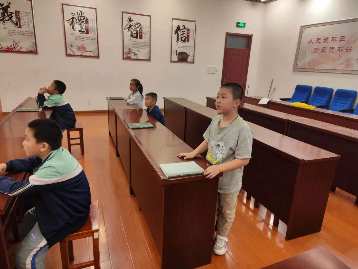 5月27日,周六启智班分为上午下午两个课时。上午启智二班第一节课开课,同学们在王艳蕙老师的带领下礼敬圣贤后做静心功课,之后进行了经典诵读;第二节课由春霖妈妈给孩子们上课,她先带领大家复习了上一课所学的内容,然后再次进行了礼仪训练;第三节课王艳蕙老师给孩子们播放了德育故事视频,并让孩子们分享了自己的感悟。