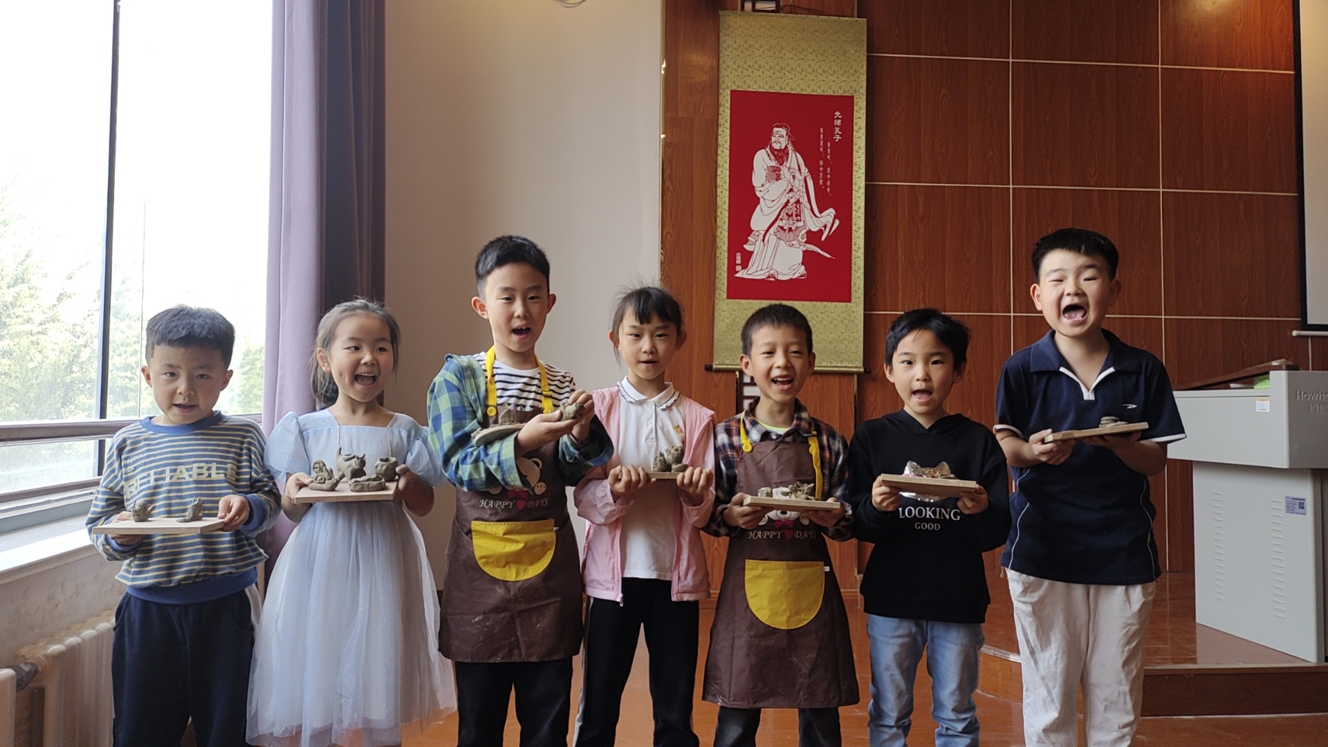 第二课为泥塑课。孩子们聚精会神地看着老师在台上手把手教我们捏小猫咪,一小会功夫一只漂亮可爱的小猫咪就展现出来了。接着老师让同学们开始自己动手捏。不知不觉一节课就过去了,孩子们意犹未尽。