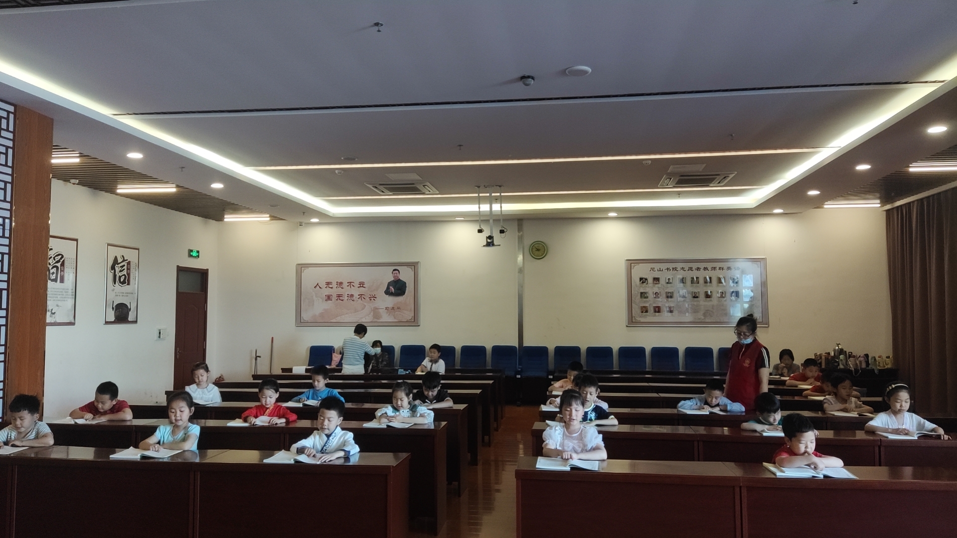 上午8点10分开始签到,同学们在家长的带领下来到二楼国学堂,早到的同学接龙领读《三字经》做课前收心。