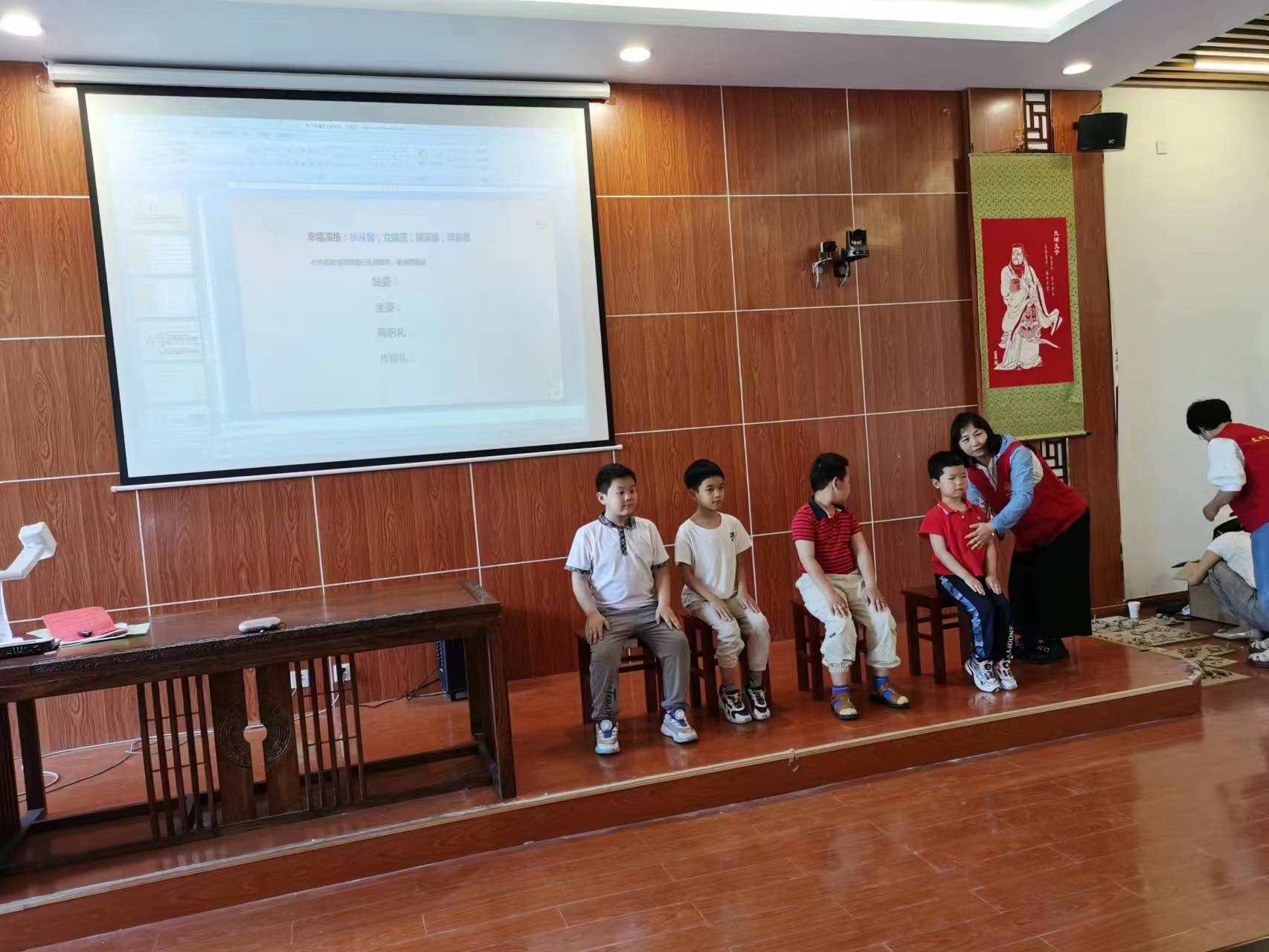 第二节课由周璇老师给孩子们上课,先带大家复习了上一周所学的内容,这一周我们学习《弟子规》中的谨:步从容,立端正,揖深圆,拜恭敬。并再次让孩子四人一组上台进行了坐姿、站姿以及行礼的训练,孩子们练习得很投入,接下来都坐得非常端正。