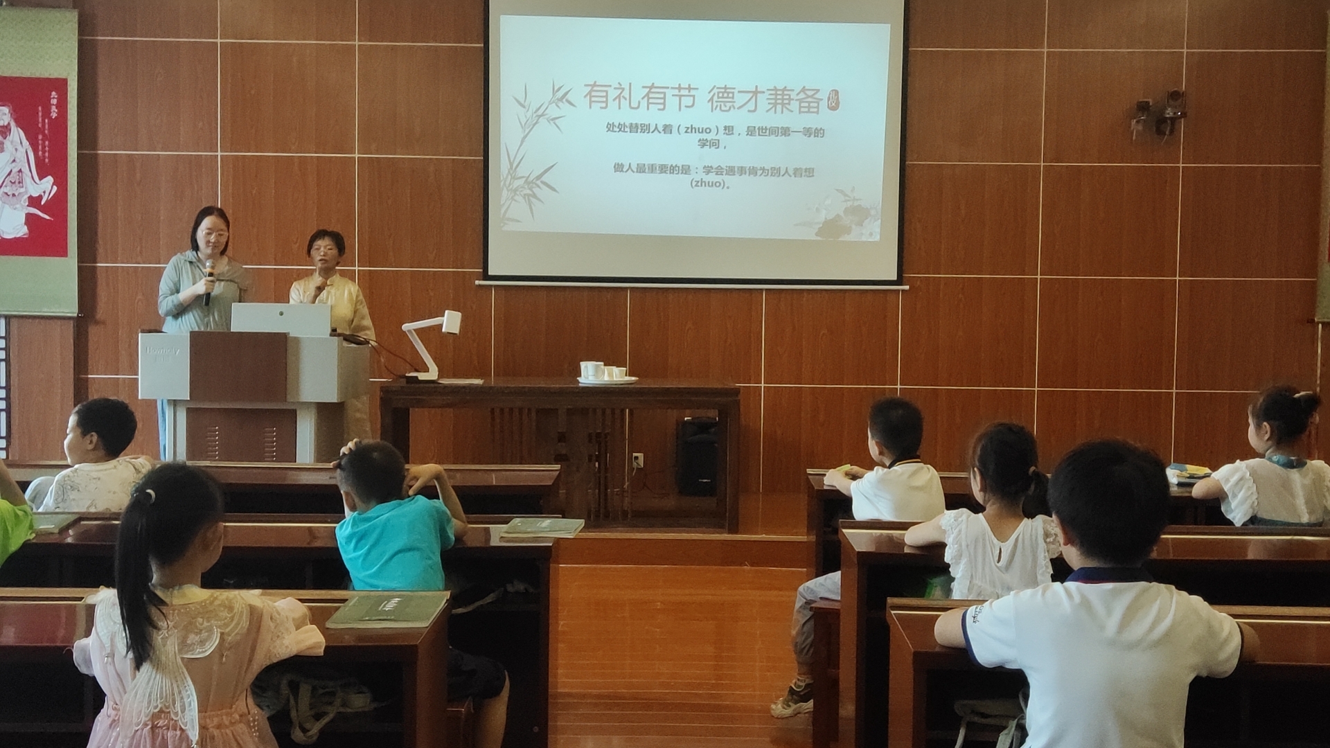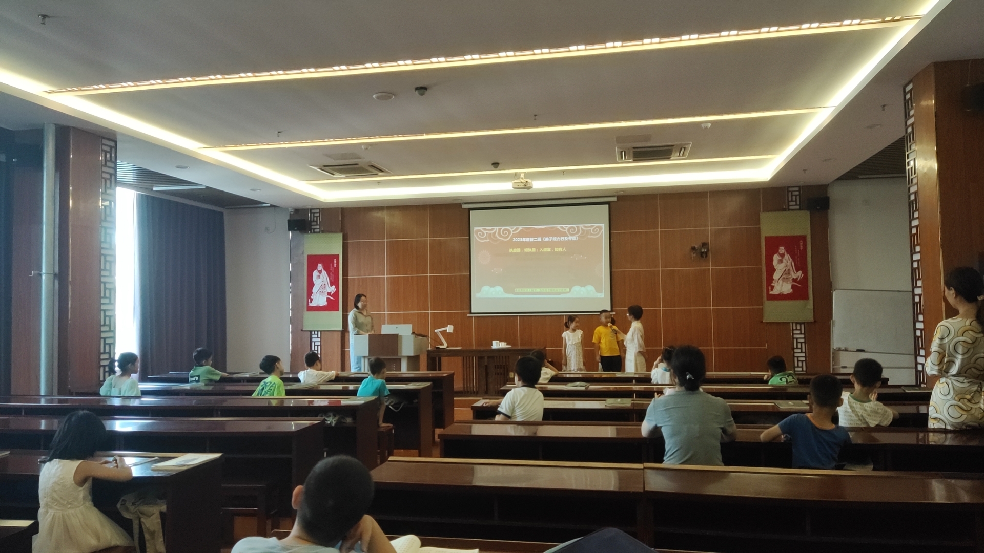 上午8点10分签到,同学们在家长的带领下来到二楼国学堂,早到的同学开始吟诵《千字文》做课前收心。