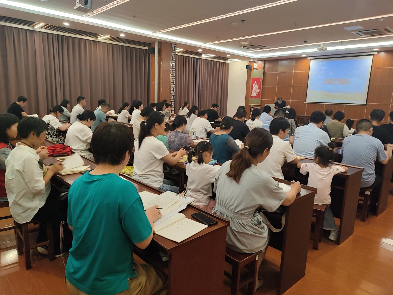 晚7点20分,家长们在迎宾老师的问候下陆续进入教室。让经典开启智慧,将经典智慧应用到日常生活中。家长是孩子最好的榜样,您认真学习的态度,定能传递给孩子。