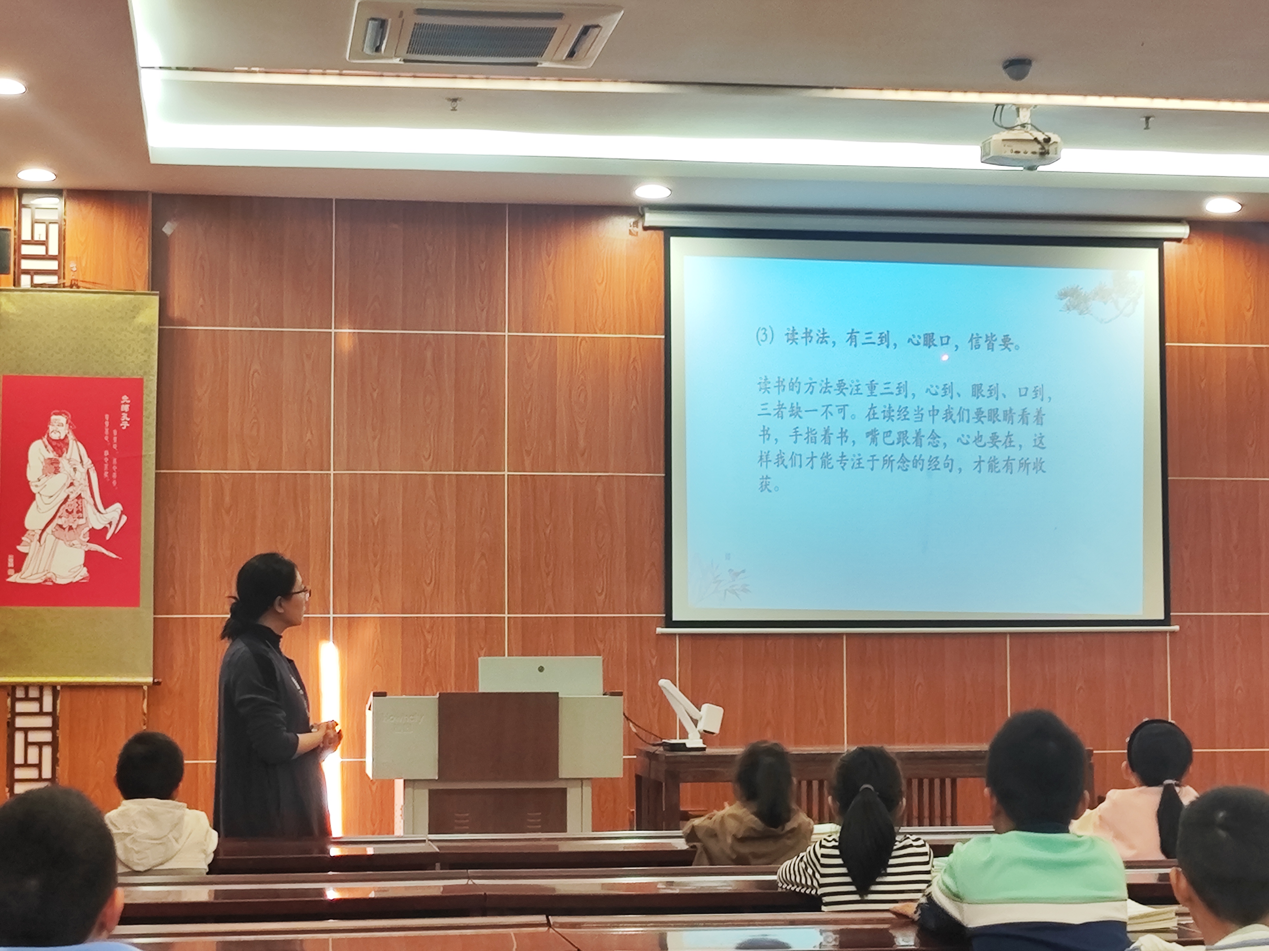 下午2点10分,同学们在家长的带领下陆续来到教室,早到的同学首先对课堂进行了简单的清扫,之后跟随读经机一起读诵《道德经》。