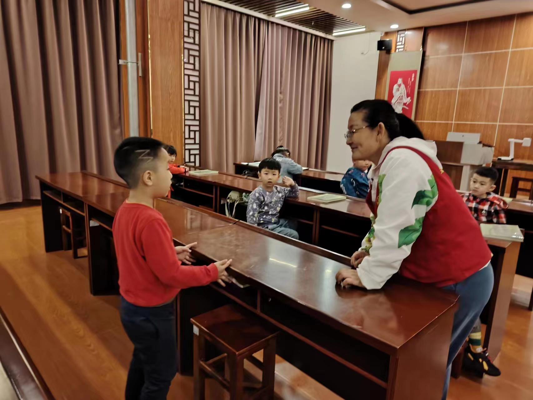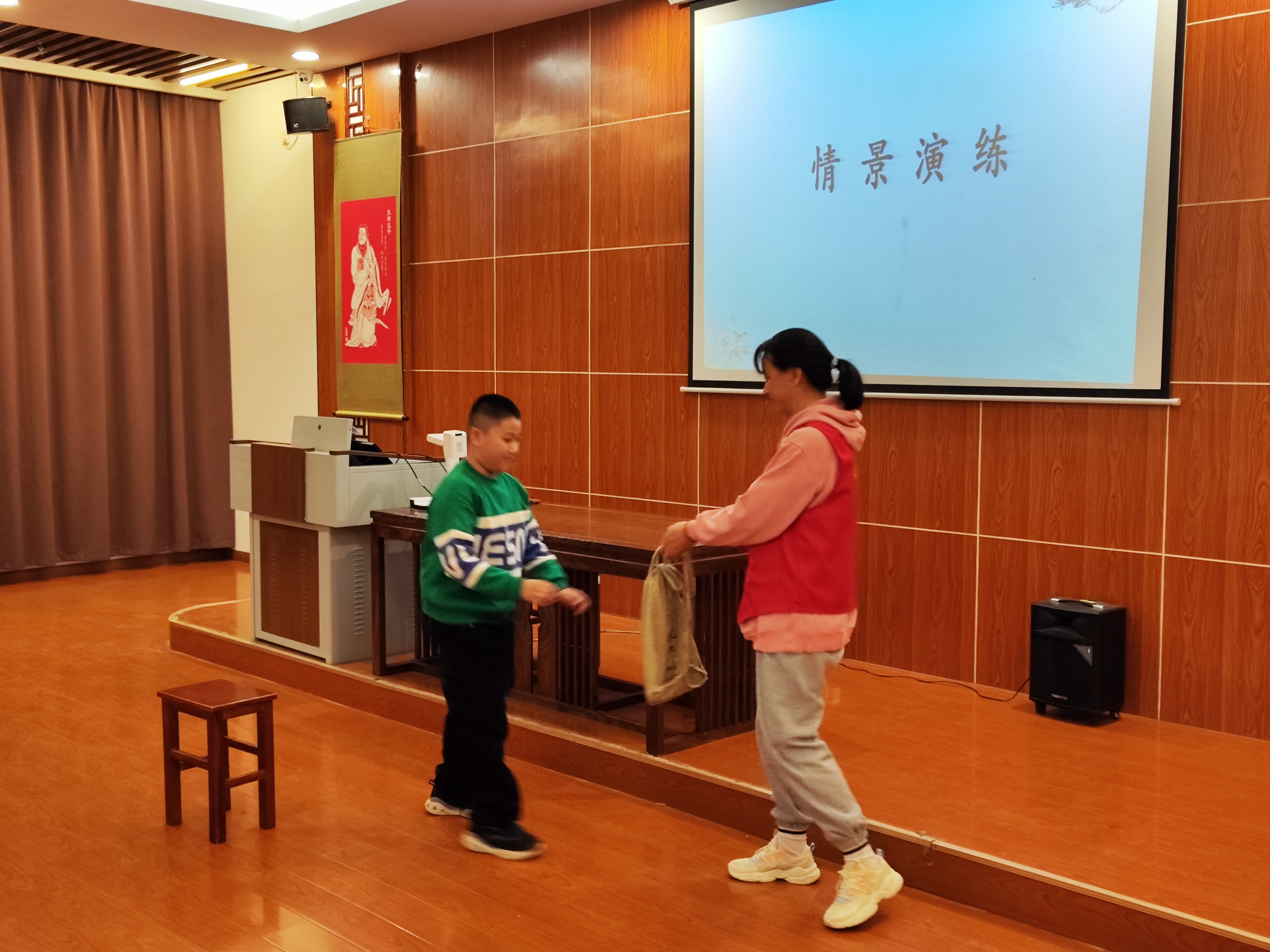 下午启智一班准时开课。第一节课,王芳圆老师首先和同学们复习了上周所学的《弟子规》入则孝部分,之后便开始本周《弟子规》的讲解;第二节课,王芳圆老师安排两组同学进行了情景演练。两组同学事先都进行了排练,所以演出时非常从容,赢得了台下同学阵阵掌声。情景演练之后,同学们跟随读经机进行了《论语》第一、二章的读诵,读诵完成后王芳圆老师还对同学们易读错的字进行了纠正。