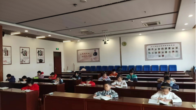 上午8点10分,同学们在家长的带领下来到二楼国学堂,早到的同学跟周旋老师诵读《道德经》做课前收心。