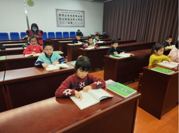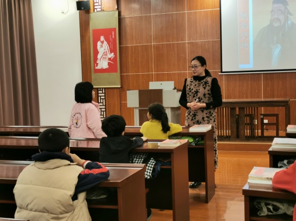 下午2点10分,同学们在家长的陪伴下陆续来到书院。课程开始前,同学们在讲台前轮流领读《论语》。