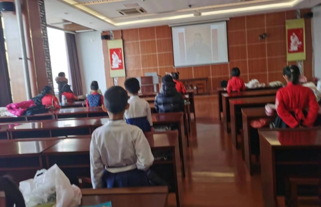 上午8点10分签到。同学们在家长的带领下来到二楼国学堂,早到的同学跟周旋老师诵读《道德经》做课前收心。